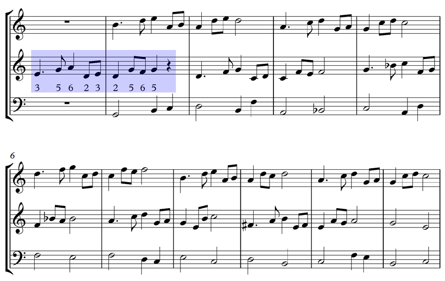 le prime due (batt 6 e 8 sopra) che imitano il modello a intervalli di quarta e quinta ascendente